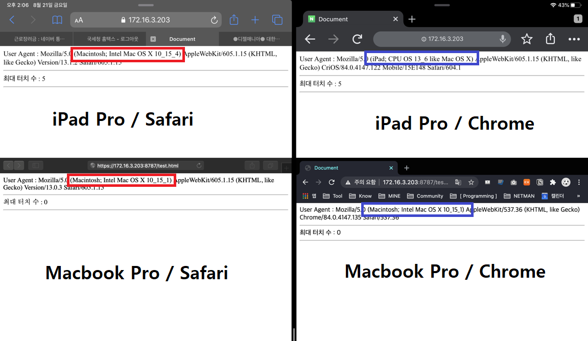 | Safari Browser | userAgent에 Mac OS 포함 | userAgent에 Mac OS 미포함 |