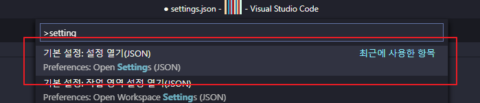 명령 팔레트(Ctrl + Shift + p) 실행 후 사용자 설정 열기