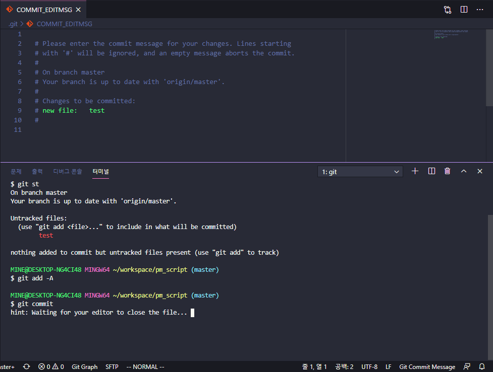 이렇게 하면 editor에서 commit 메세지를 남길 수 있다.