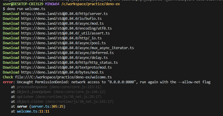 아래처럼 --allow-net이라는 네트워크 접근 허용 옵션을 주면 실행이 잘된다