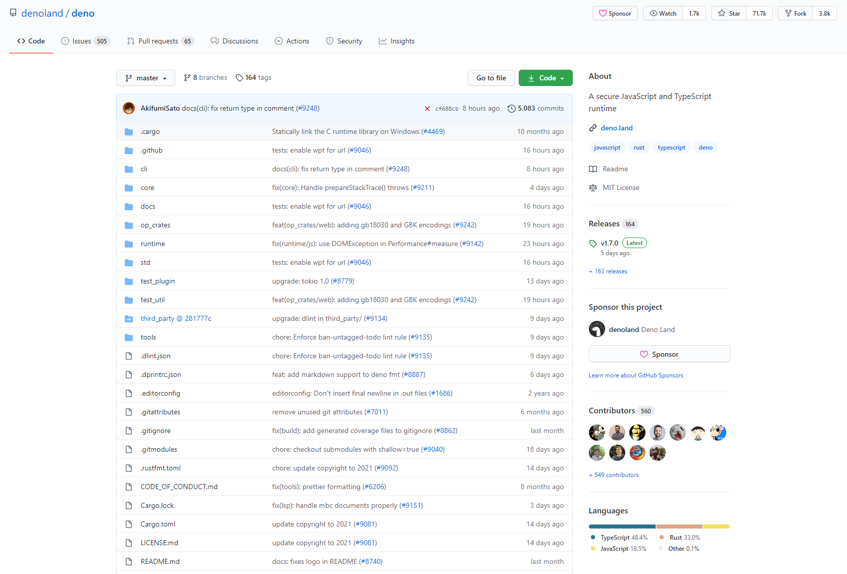 Deno는 V8 엔진을 사용하는 Javascript / Typescript를 위한 런타임 입니다. (Rust로 제작됨!)
