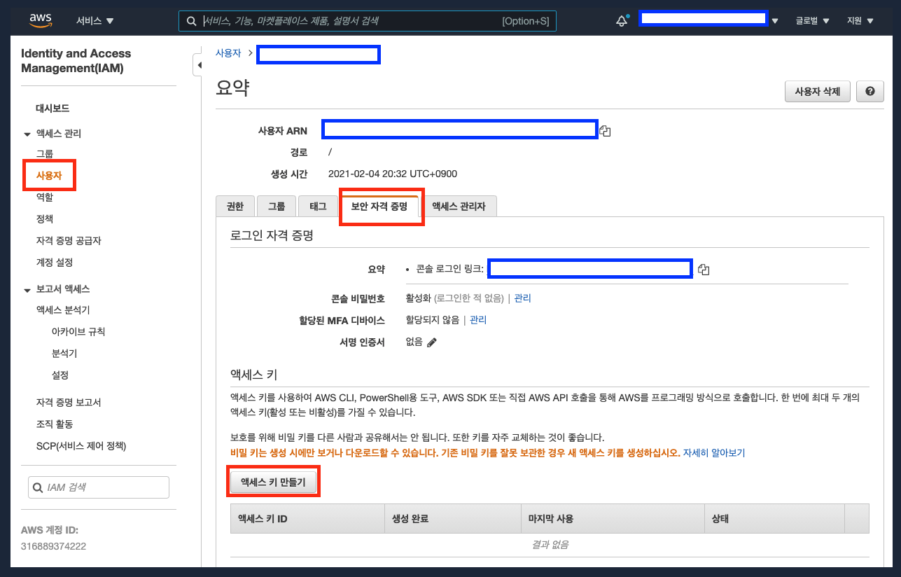 - console 접속 → IAM 관리 콘솔 → 엑세스 관리 → 사용자
