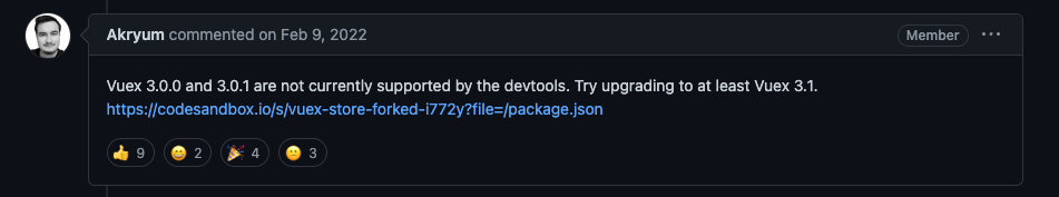 Vuex 3.1 미만의 버전과 Vue DevTools를 같이 사용하면 오동작을 한다고 합니다.