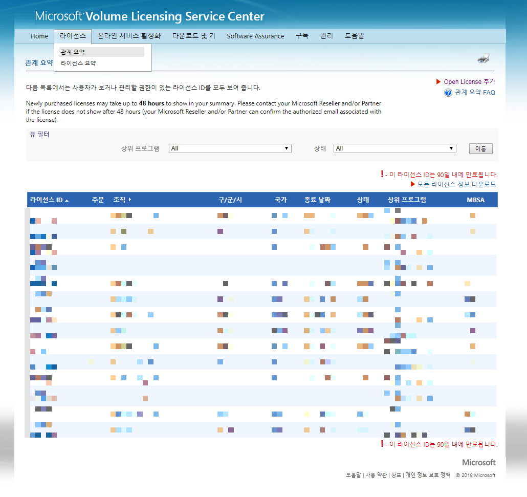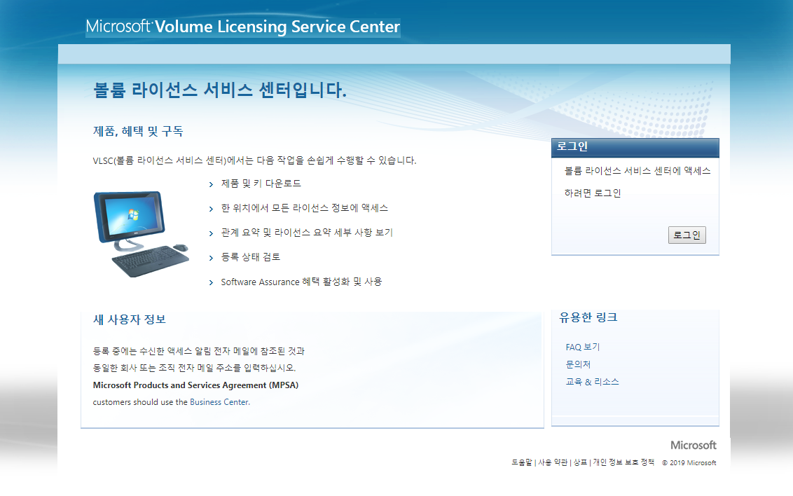 마이크로 소프트의 제품 구매 시 볼륨 라이선스 서비스 센터(위 그림의 링크)에서 라이선스를 관리할 수 있다.