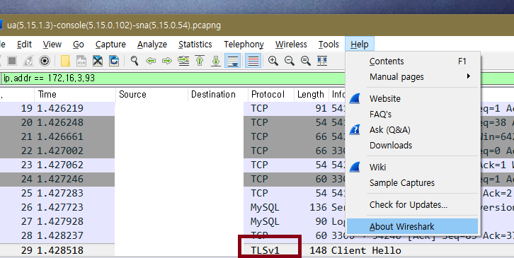 기존에 wireshark 버전은 v2.4.5 였고 업데이트 한 버전은 3.0.1 이다;;;