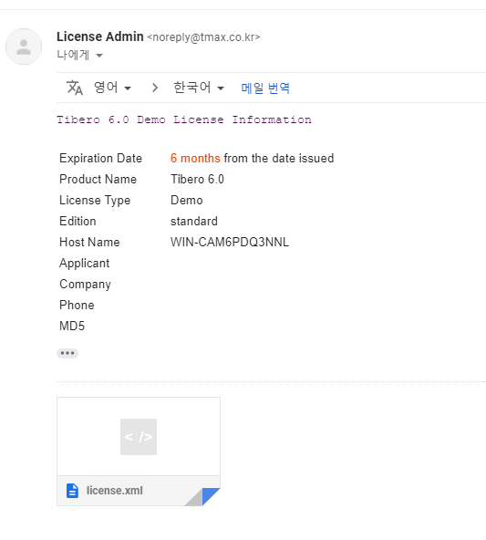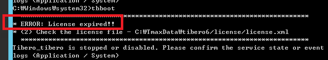 * license.xml을 다운로드 받아서 Tibero 설치 경로의 license 디렉토리로 이동 및 재시작