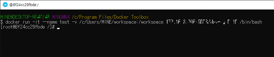 $ docker run -it --name dev7 -v /c/Users/MINE/workspace:/workspace 이미지 이름 /bin/bash