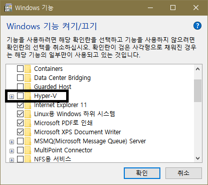 뭐 크게 문제 아니라고 생각하고 구글링 통해서 하라는 Hyper-V 기능 비활성화 하라해서 봤더니 체크되어있지 않네;;